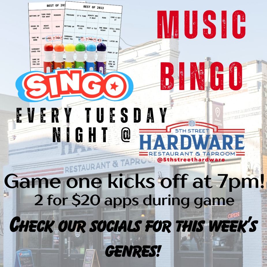 🎶 Singo Music Bingo at Hardware! Join us every Tuesday at 7 PM for a night of music, fun, and prizes! 📍