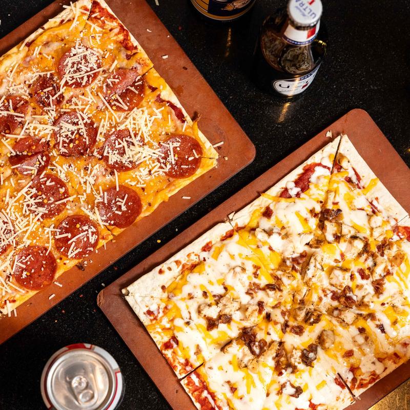 Crispy flatbread with a savory BBQ base, topped with melted cheese, grilled chicken, crispy bacon, and fried onions, finished with our special house drizzle.