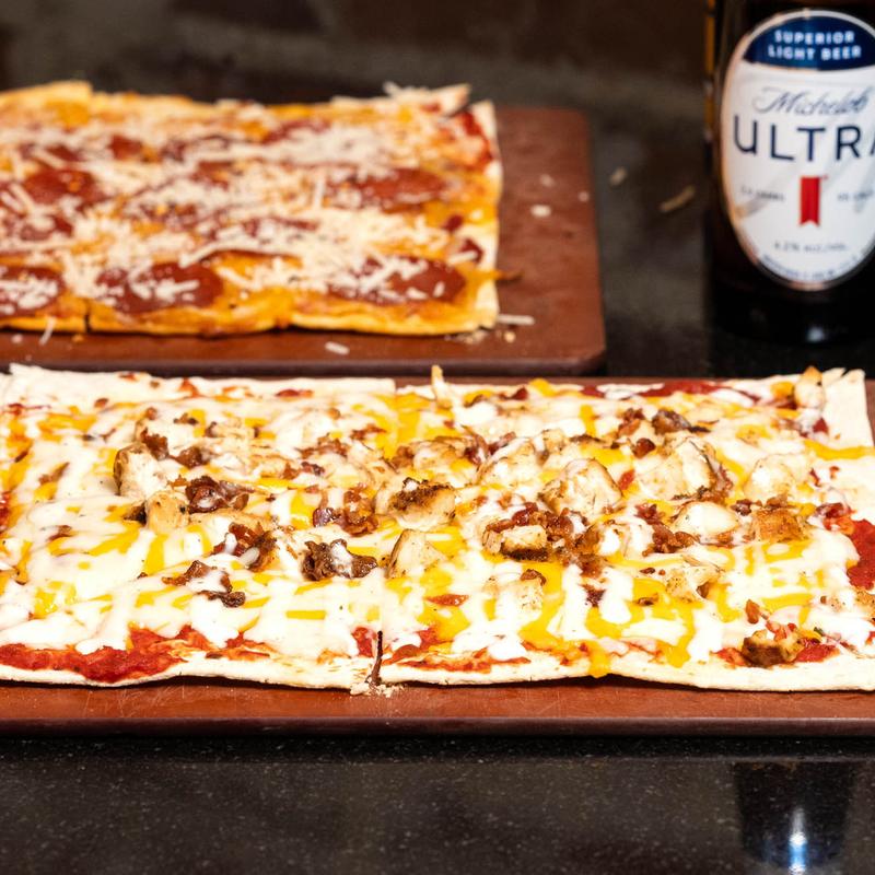 Crispy flatbread topped with taco sauce, taco-seasoned ground beef, fresh lettuce, juicy tomato, and a blend of melted cheese. A flavorful twist on a classic favorite!